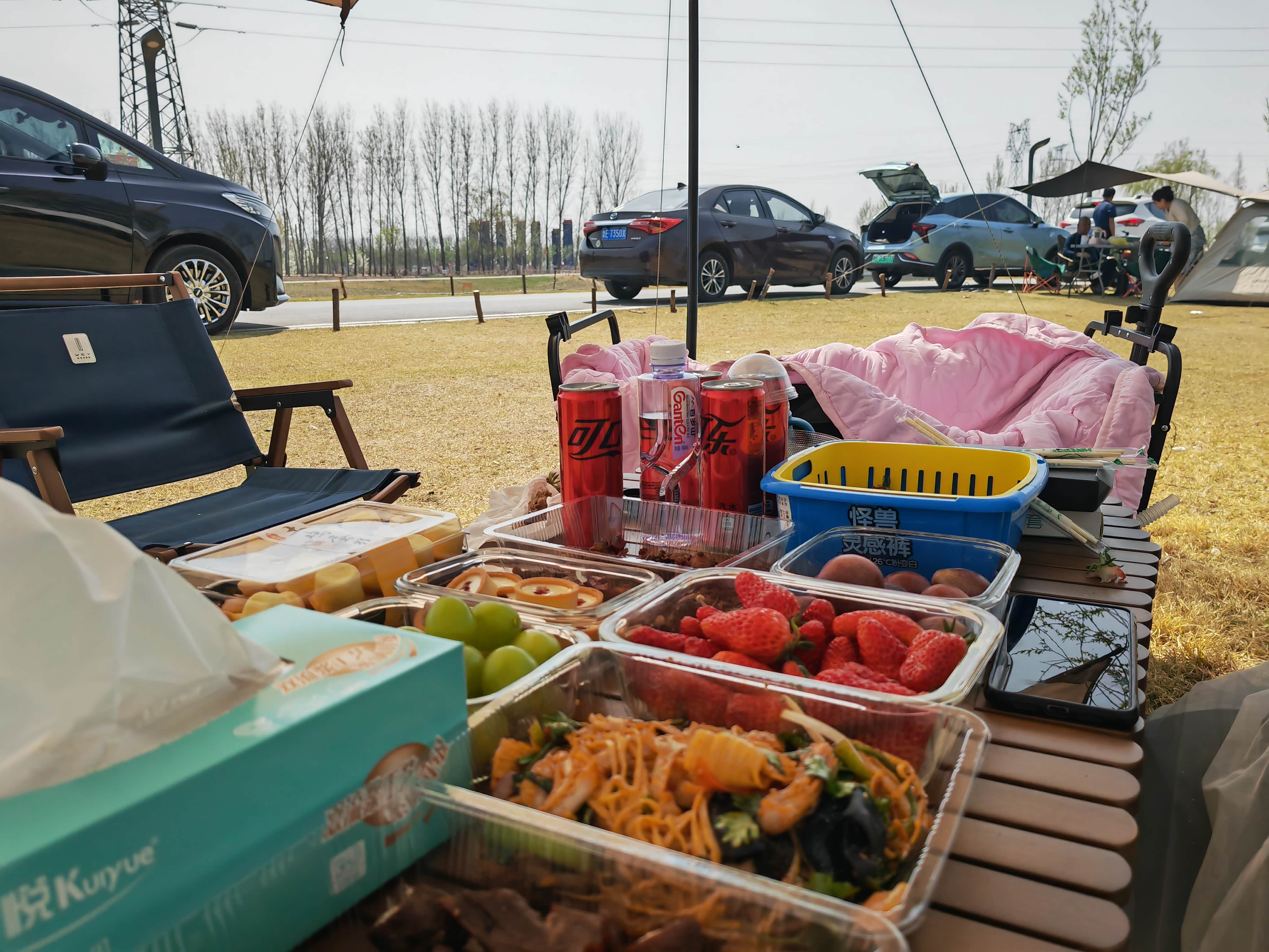 费用记录:这次消费水果(李子、晴王、草莓)45元,熟食(麻辣鸡块、凉菜、鸭脖)55元,米饭自带,鸡胸脯肉30元,配菜(土豆胡萝卜油)10元,车辆耗电70公里,家用充电50元,饮料15元,合计205元,营地免费,装备天幕桌椅炊具等免费。