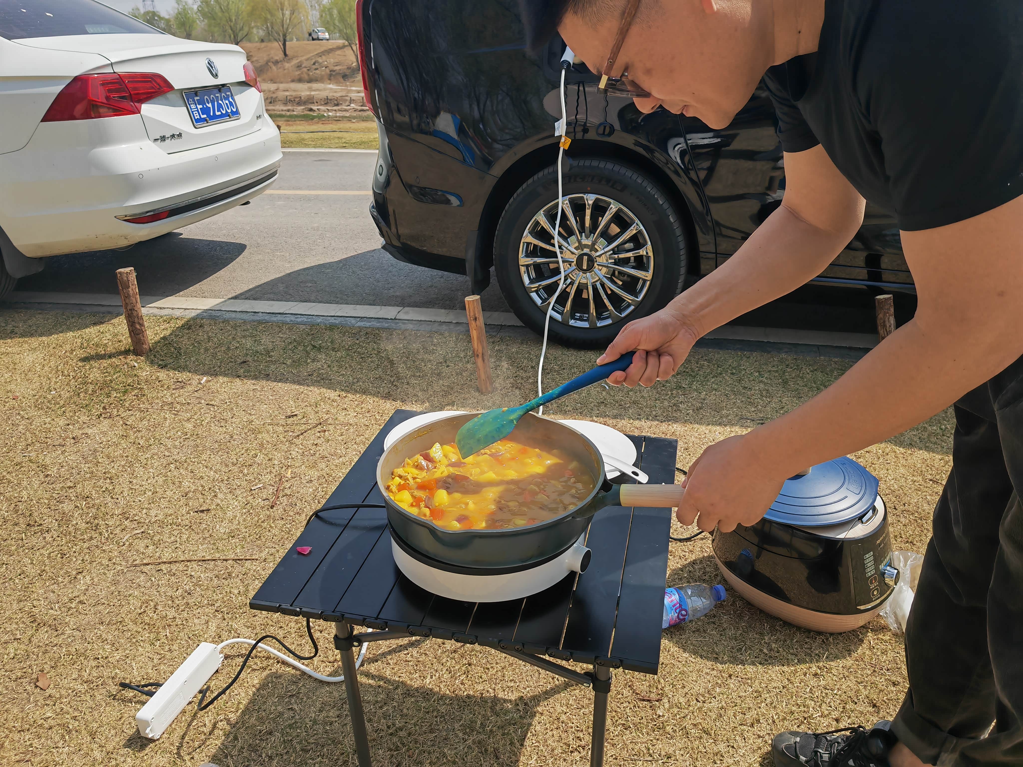 如果想让车辆持续供电就打开发动机,无论是烧水壶、电磁炉都能轻松使用,这次做咖喱鸡米饭,只用时10公里电耗,米饭是提前煮好的,开车到郊区用了60公里的电,整体能耗低,这样充足的电量,来个海鲜大咖也是不在话下,外出露营开上魏牌高山就对了,绝对够舒适享受~