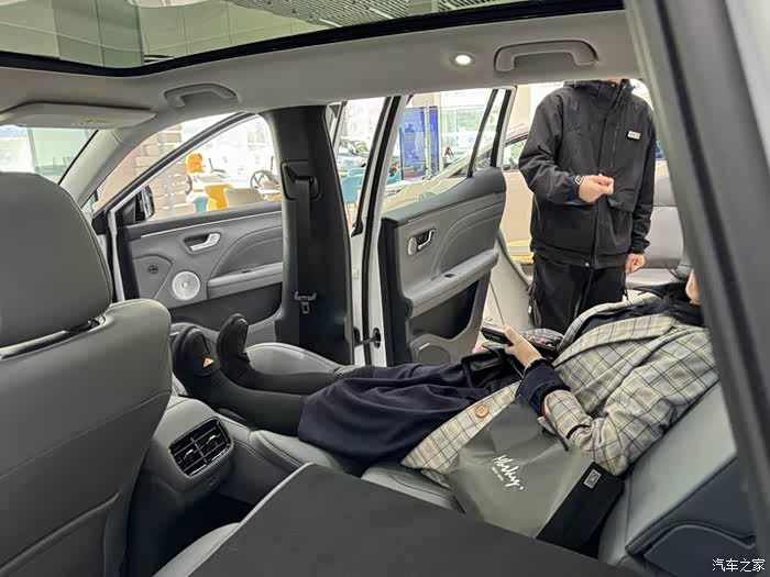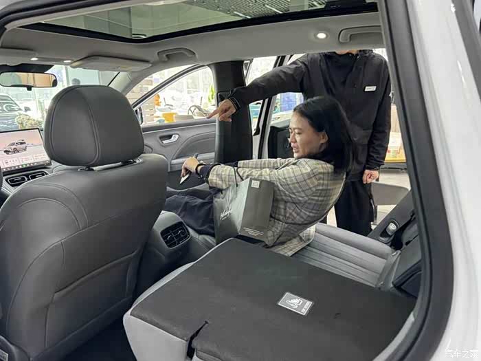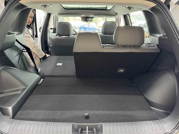 最让我心动的是空间扩展——副驾靠背能完全放倒,我当场试了试,躺进去午休刚好,以后跑长途累了,随时能找个地方歇会儿,这个设计太贴心了。后备箱常规空间不算特别大,但把后排座椅放倒后,能铺成一个纯平的大空间,放露营装备、行李箱都绰绰有余。
