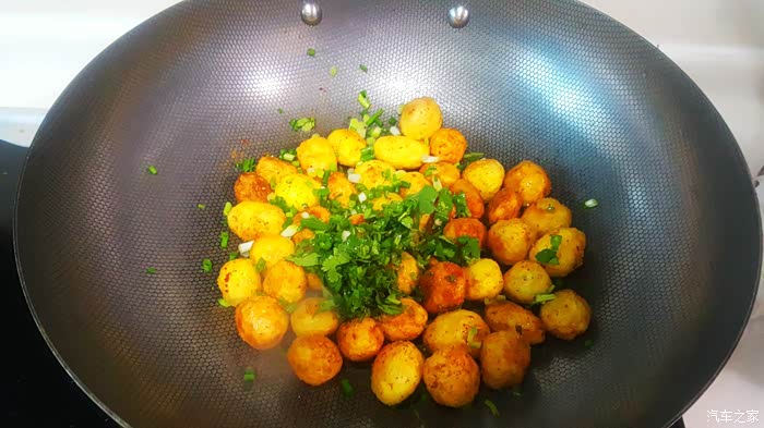 ▲贵阳有一个东西叫做“大锅洋芋”,是一个遍布了贵阳的小美食,里面加了香菜和香葱,使土豆的香气更加能释放出来,而且能去一些油腻,所以第二轮的时候要把香葱和香菜给放进去