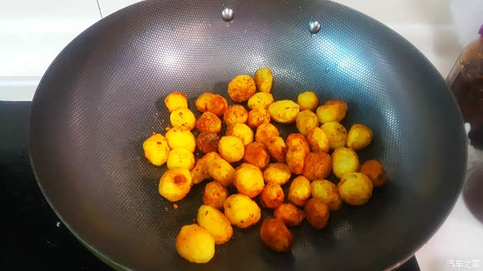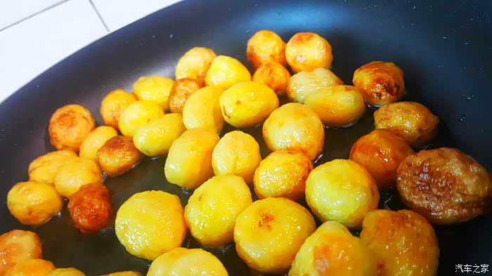 ▲煎了差不多五分钟,已经出现外表酥脆的壳子了,其实这个时候,如果想吃生一些,也可以出锅了,金黄色的小土豆,看着可真是漂亮啊!