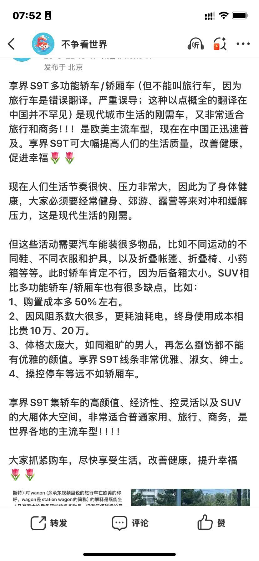 享界S9T让华为给毁了!!这种车在全世界都是主流车型,华为却一根筋的把它定位为极其小众的旅行车。请详看附件5个。