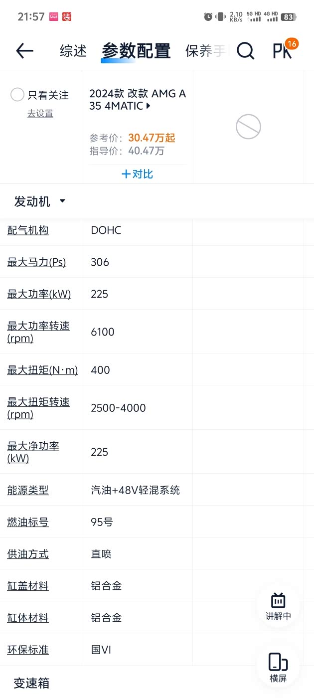 新款AMG A35 都搭载2.0T涡轮增压四缸发动机以及48V电机组成的轻混系统,动力系统这块与老款2024款都是48V轻混,纯燃油机的马力都在300牛左右。这套系统峰值扭矩400,极速为250公里/小时。也是采用了传统老款的八档双力和变速箱。