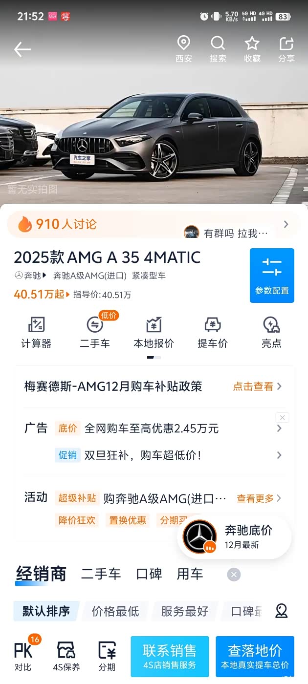 近期,奔驰AMG发布了很多款新车,大部分为40万元起售。今天我来主要聊一下奔驰AMG A35这车吧,这个是AMG系列里面价位比较低的性能车了。12月12日,奔驰mg发布了新的改款2025款A35,价格呢是40万元起售。我对比了一下老款2024款Amg A35,发现整体的外观没有太大差异。价格呢与老款保持持平,都是40万元左右起售。但是老款目前降价幅度很高,降幅有10万元左右,现在裸车价只有30万元起售。新车呢目前这个优惠政策不详,指导价为40万元。