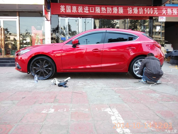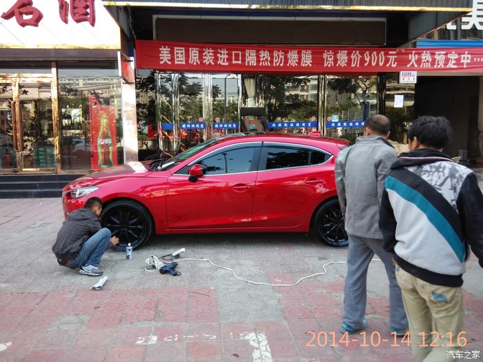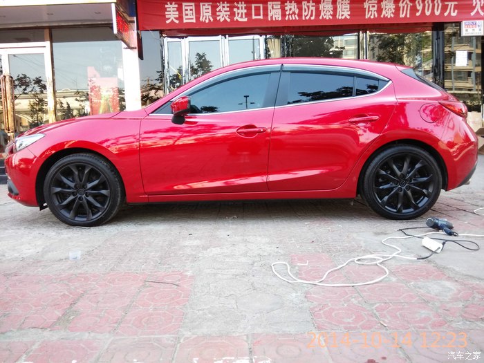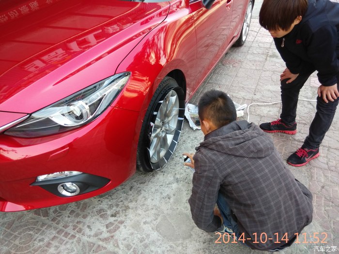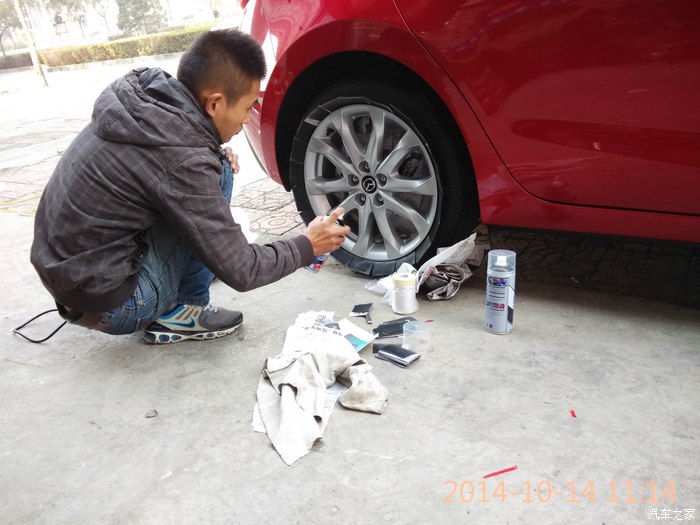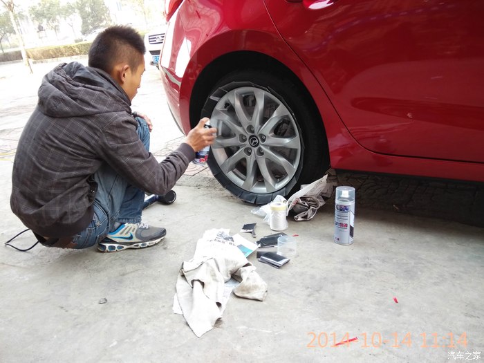 这次满月,留个纪念,顺便给轮毂喷了个膜改了改色。说到改色,一直想弄个个性点的颜色,但思来想去,还是觉得红配黑最经典,所以,最后还是喷了黑色。也看过很多网友自己动手,从网上买回四五瓶喷膜,然后准备两副扑克,还有废报纸或者塑料袋,很容易就喷好了。但无奈楼主太懒,所以趁着出去洗车,直接让洗车店给喷了,价钱小贵,肯定没有自己买自己喷的划算,谁让咱懒呢,懒是要付出代价的