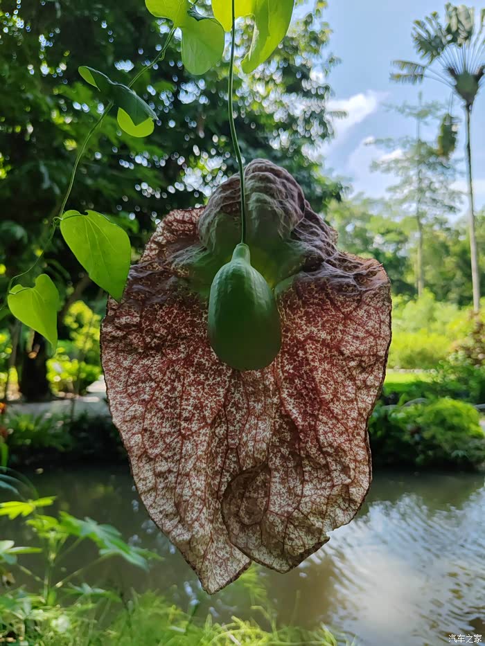 大花马兜铃,膨大的兜状物散发出来的怪异气味能吸引昆虫进入背面“小兜”里,昆虫一旦进入“小兜”,就难以钻出