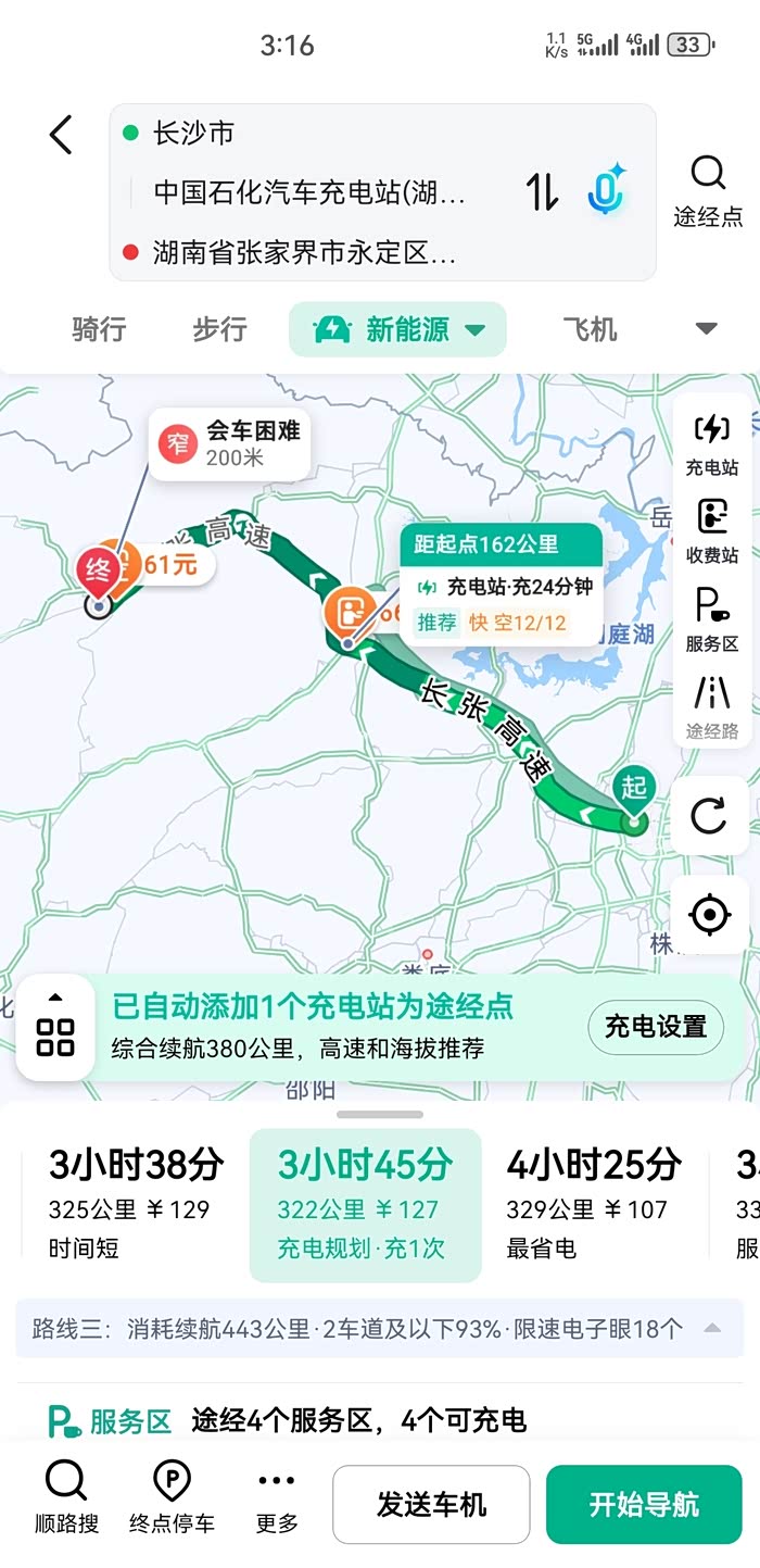 2. 充电规划:极狐阿尔法T5续航500km+,满电可直达目的地;若需补电,优先选择宁乡服务区或常德服务区快充桩(单程仅需1次补电)。