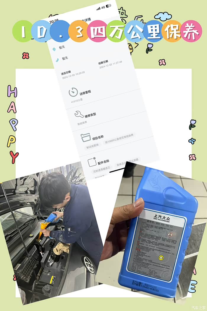 如果自己不知道爱车该做什么保养,那就进入上汽大众超级APP里的预约保养里面查看,里面有保养公里数推荐更换的项目!赠送的三次保养我都用完了,正好店里有活动我就又购买了三次基础保养,还赠送了制动液更换!维修保养车间干净整洁,师傅看着岁数不大但是干活认真细致,更换刹车油的过程中滴漏!并且把我前机盖里面都擦的干干净净!