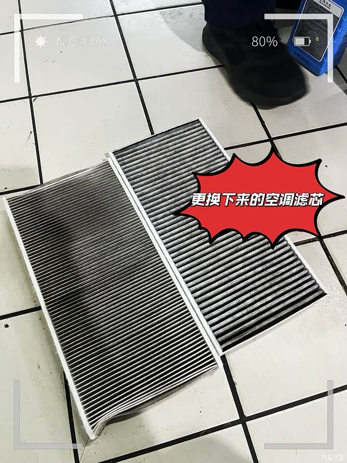 换下来的空调滤芯,第一层比较脏,第二层因为是活性炭净味滤芯,脏东西都被第一层过滤,第二层所以不脏,但是活性炭在长期使用的过程中已经失效,所以都一起更换就行了!