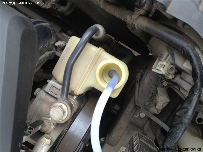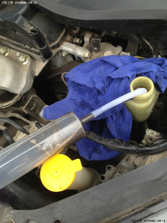 马上观察。摇晃车身,突然发现有2个液面,油盒上半部已经空了,下半部还是满的,中间明显分开了。原来这个小小的油盒,还内有乾坤,分了上下两部分。油盒背部接助力泵的也是两个接口,一个进一个出。这下麻烦了,一次只能抽到120左右。整个系统里面估计有600毫升左右的油。。。人家海马、polo什么不就是一个塑料筒吗,我们的怎么这么复杂。