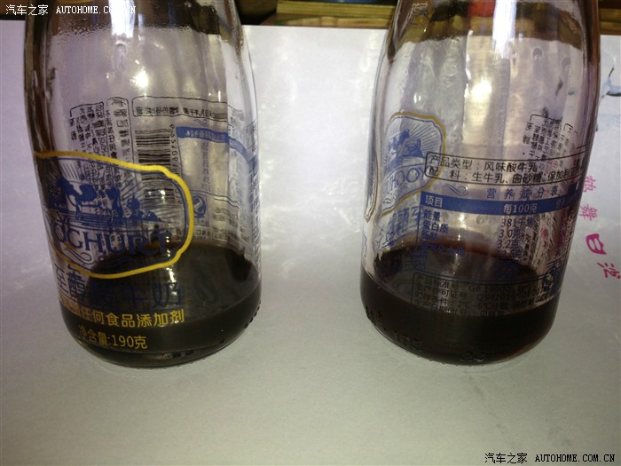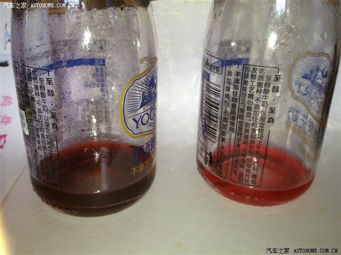 这个左边是第一次抽出来的。 黑得就像酱油,感觉也像酱油,没有油质的感觉。右边是第2-3加油后抽出来的,已经有点红色了。