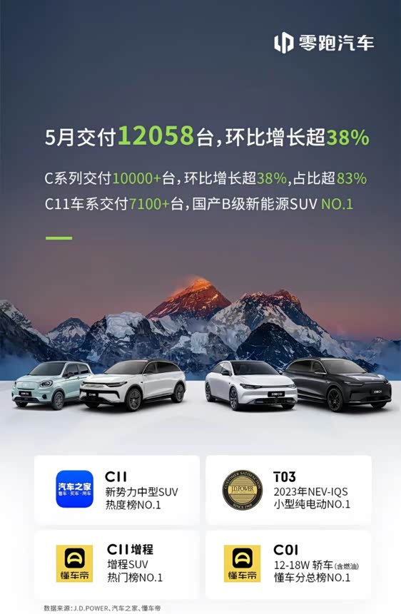 C系列车型破万台,C11车系超过了7千台,首创历史新高!从整个五月四次周榜我们可以看出,零跑已经连续一个月霸榜第二名。零跑以重新定义15-20w价格,持续霸榜一个月榜眼,说明零跑还有很大的潜力能更进一步!