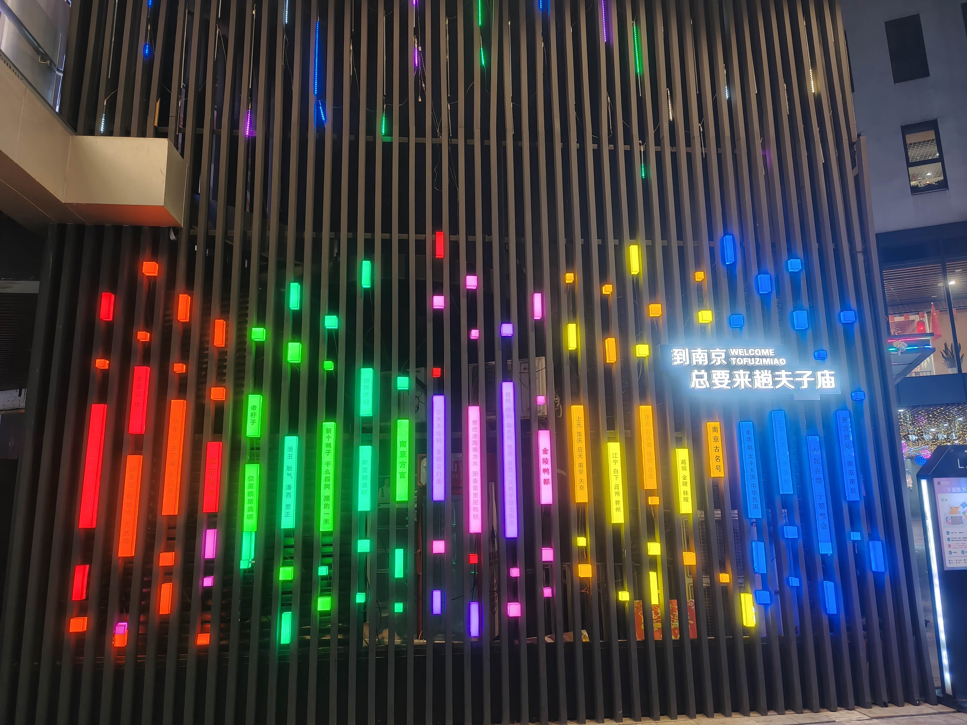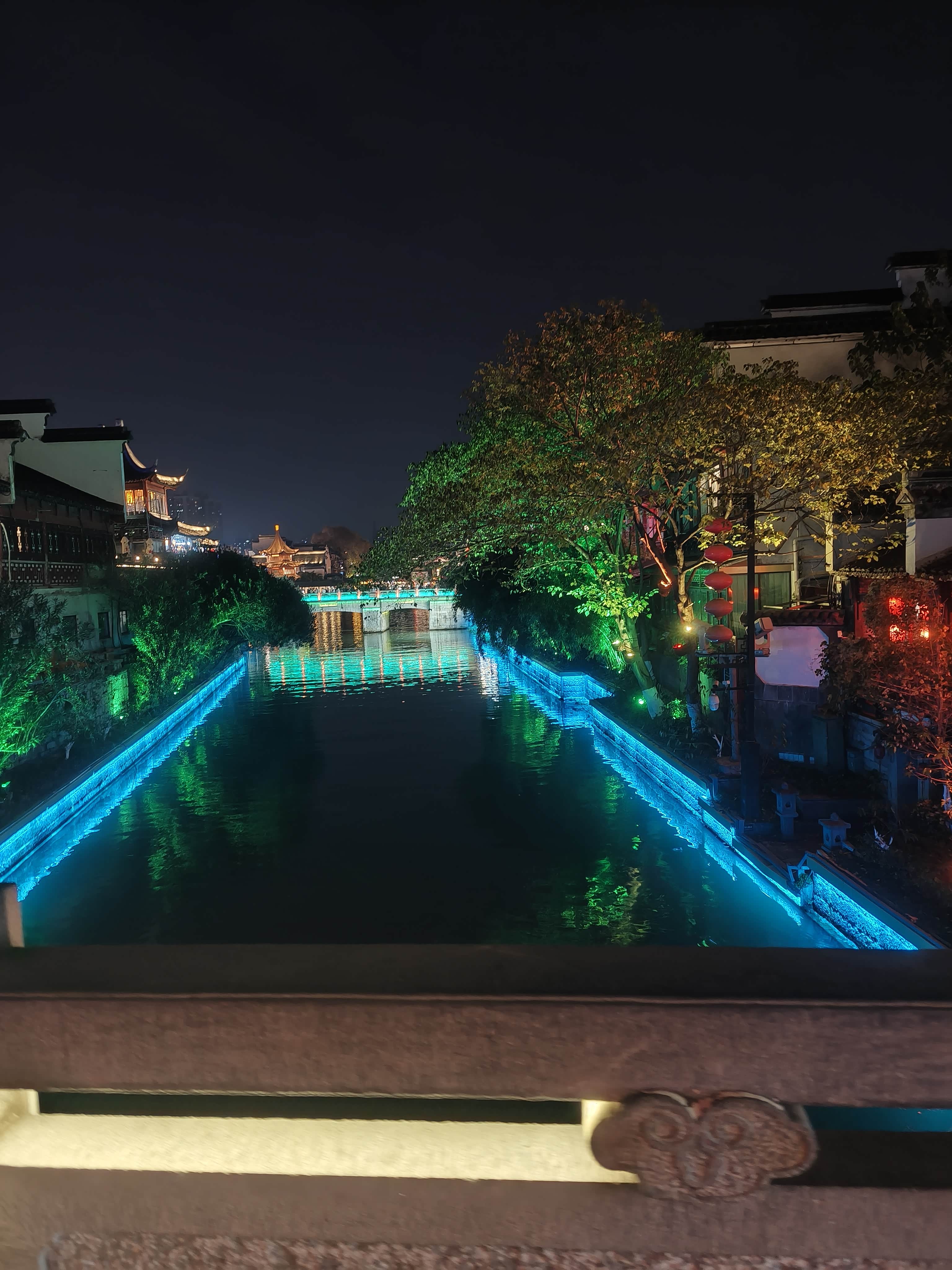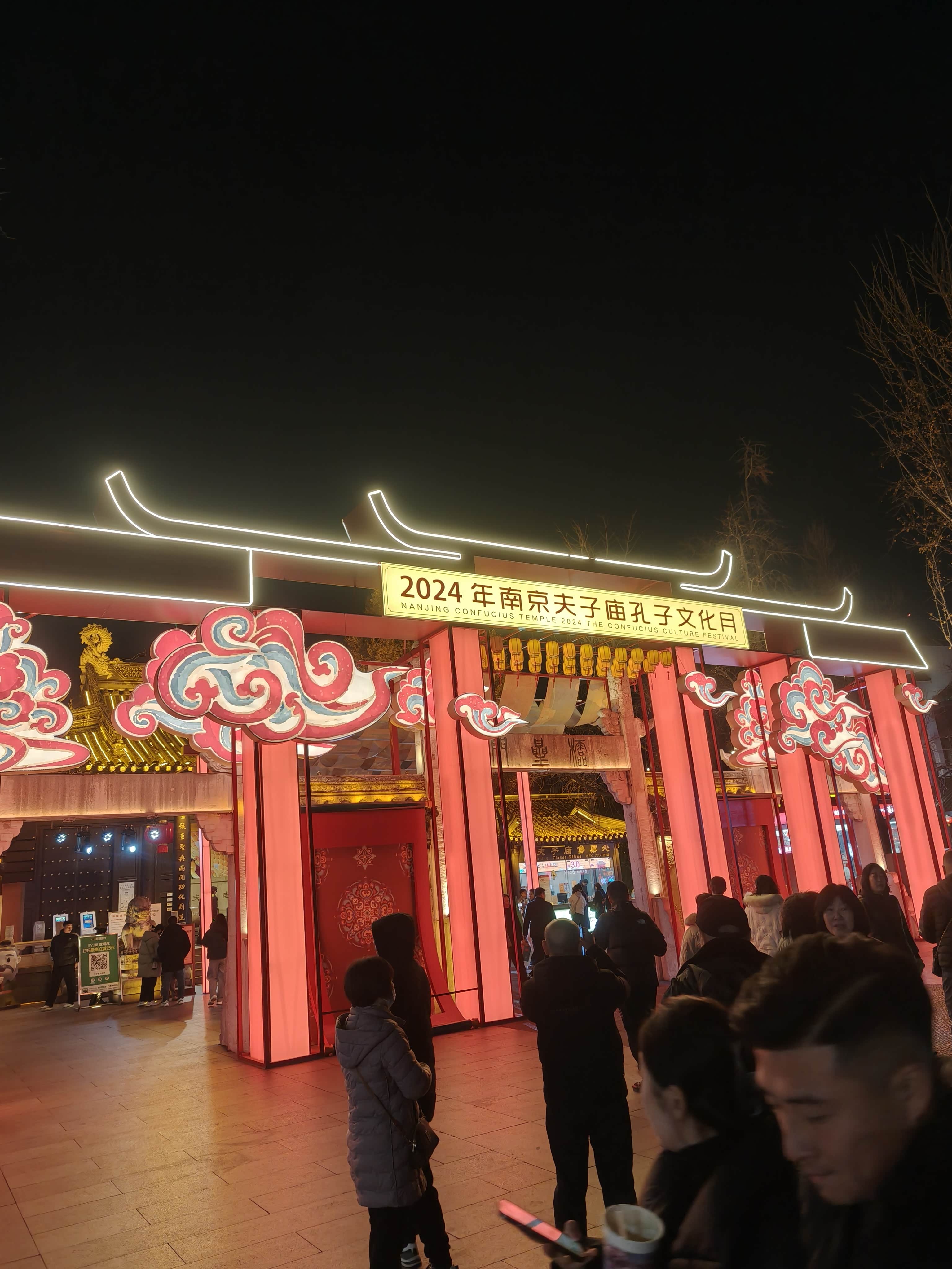 晚上的秦淮河画舫夜游是孩子们最期待的环节。提前线上订好票避免了排队,选了靠窗的位置,看着两岸的灯光倒映在河面上,魁光阁的剪影与文德桥的“半月奇观”相映成趣。我借着沿岸的诗词灯带教老大认字,他指着“烟笼寒水月笼沙”的诗句,兴奋地说早上在车里听过这个故事。下船后直奔老门东,陆氏梅花糕和蓝老大糖粥藕的香甜气息弥漫在巷子里,孩子们边走边吃,脸上沾着糖渍,成为了旅途最生动的注脚。