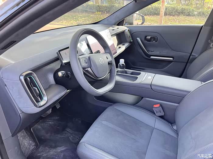 开起来的感受也超出我的预期。电机动力很线性,起步的时候提速快,但一点不窜,平时上下班高峰期跟车,不会有顿挫感,我老婆这种拿证没多久的新手,昨天试开了一段,说开着也不慌。方向盘带助力,操控起来特别轻盈,她现在已经敢自己开着去找自己的小姐妹了,还说比我之前那辆油车好开多了。北方这时候已经零下好几度了,开车的时候关着窗,车内隔音效果挺不错,80km/h 以内风噪和胎噪都不明显,放着孩子爱听的儿歌,几乎不受外界干扰。底盘也挺扎实,昨天走了段乡间小路,有几个小坑洼,颠簸感过滤得很细腻。