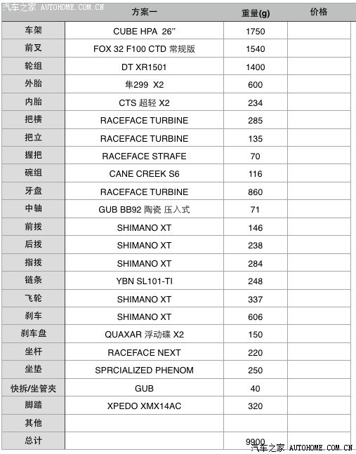 近日突然关注到了汽车之家的自行车论坛,看到如此的活跃。身为一个汽车、自行车爱好者,也来这个版块凑凑热闹。因为以玩车一段时间,所以选择了自己喜欢的配件来DIY。首先来晒下配置单。