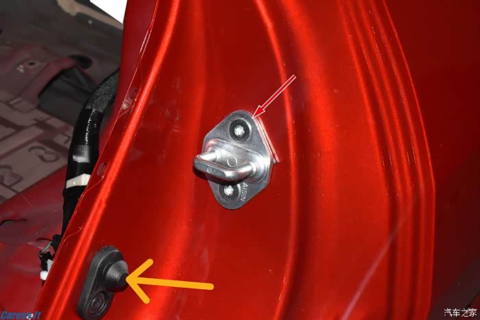 可能是造车理念的原因,很多日韩汽车在车门上还是装有缓冲块。不但如此,他们还习惯在锁扣旁边安装一个微动开关。汽车门锁微动开关通常安装在车门和车身接触的区域,当车门关闭时,微动开关的操作柄被相应的机构件按下,使电路导通;当车门打开时,微动开关的操作柄被释放,使电路断开。这种机械触发机制使得微动开关能够根据车门的开关状态改变电路的通断状态。