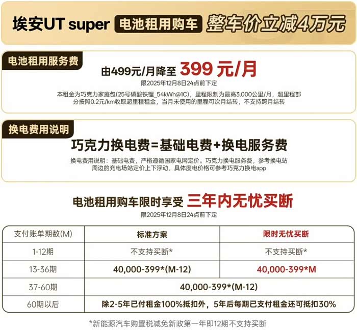 埃安UT Super作为宁德时代巧克力换电首款面向普通消费者的车型,一上市就来了个惊爆价8.99万元,租电池价格更是来到了4.99万元(电池租金499元/月)!