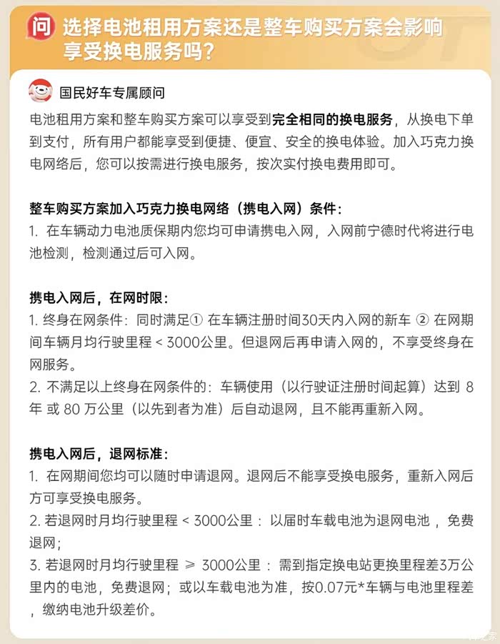 不过整车购买情况下的终身在网和终身质保其实也有一点冲突,如果我都终身在网了,那我要不要终身质保就无所谓了,反正我可以一直换电。但怕就怕你在网期间没算好,月均行驶里程≥3000公里了,那你在网时限就会变成达到8年或80万公里(以先到为准)后自动退网,且不能再重新入网。相当于8年后你电池衰减厉害了就需要自费更换了。