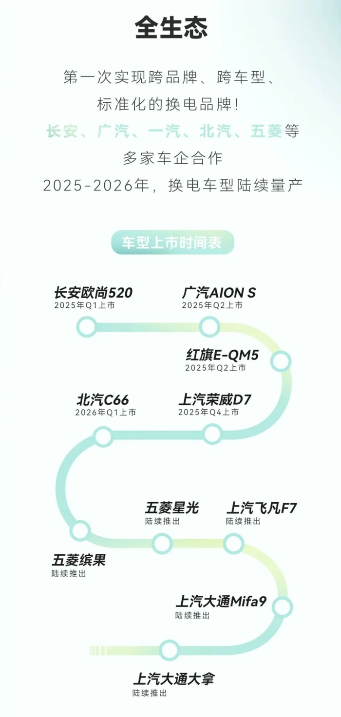 当时还发布了和宁德时代合作的长安、广汽、一汽、北汽、五菱等车企,即将推出的10款换电车型:长安欧尚520(2025年Q1上市)、广汽AION S(2025年Q2上市)、红旗E-QM5(2025年Q2上市)、上汽荣威D7(2025年Q4上市)、北汽C66(2026年Q1上市)、五菱缤果、五菱星光、上汽飞凡F7、上汽大通Mifa9、上汽大通大拿。