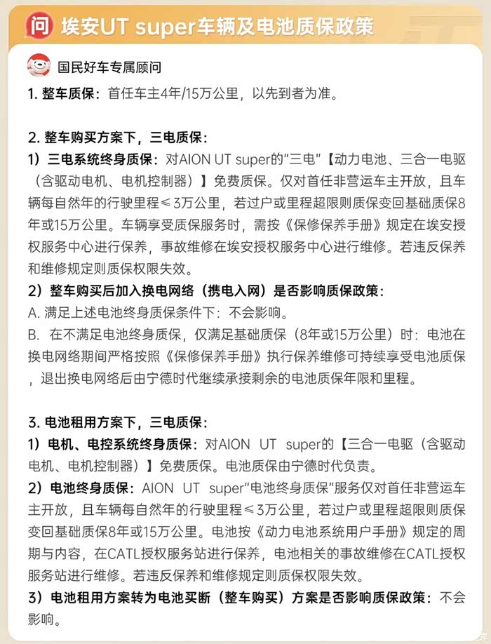 而关于车辆动力电池质保,无论是电池租用还是整车购买均享受终身质保,但限制在首任非营运车主,且车辆每自然年的行驶里程≤3万公里,若过户或里程超限则质保变回基础质保8年或15万公里。