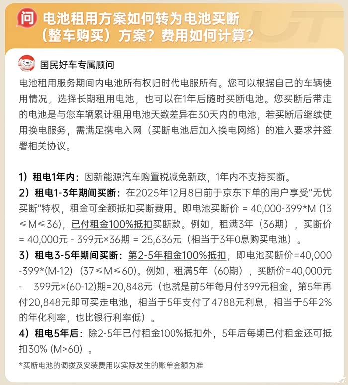 最不明智的选择就是先电池租用,然后过几年再买断,那你既没了终身在网,也有可能因为年行驶里程超3万公里,而失去电池终身质保。