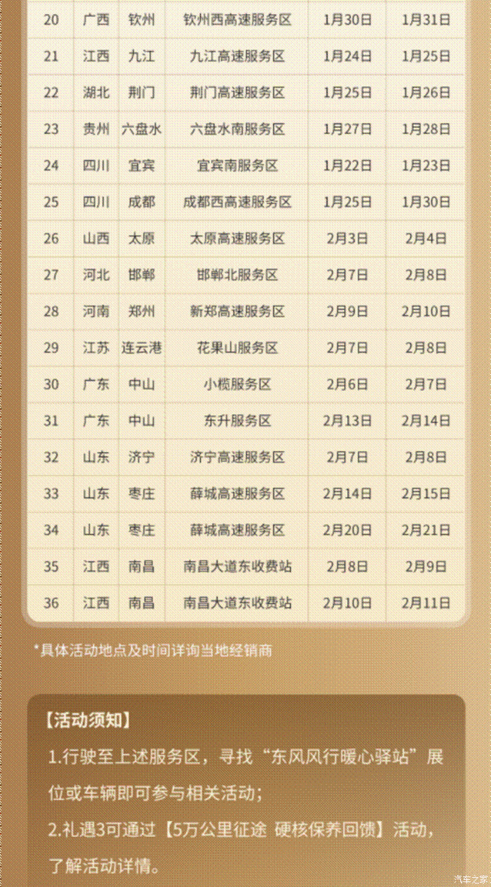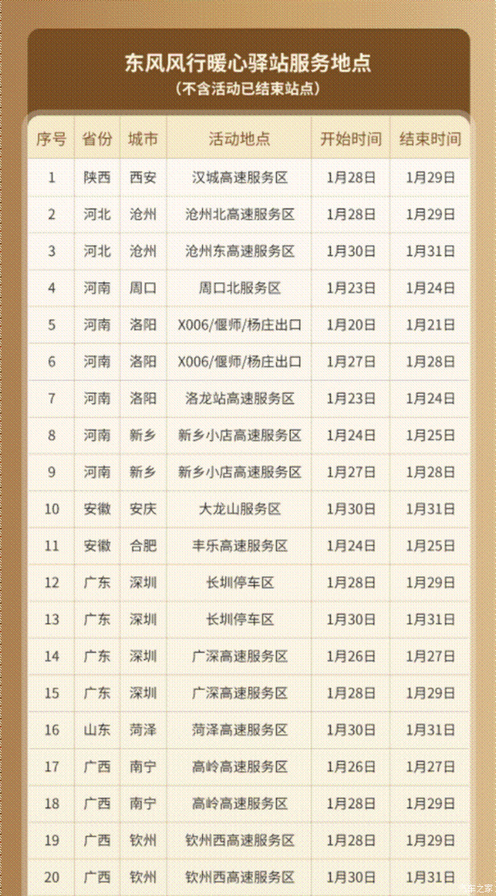 给大家分享个福利!我今年打算开V9回家过年,看到风行有高速暖心驿站活动,立马来分享给大家了。风行在全国20多个省区40多个高速服务区,都设了“暖心驿站”,可以参加活动领特色美食、免费安全检测之类的,驿站服务点我扒过来了,车友们可以看看有没有自己会路过的。