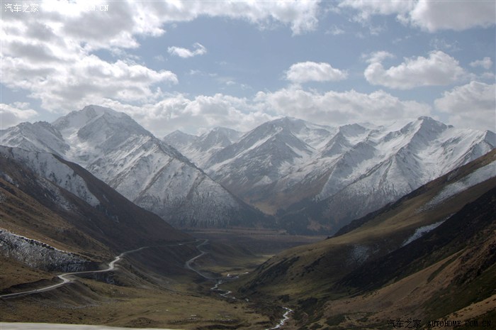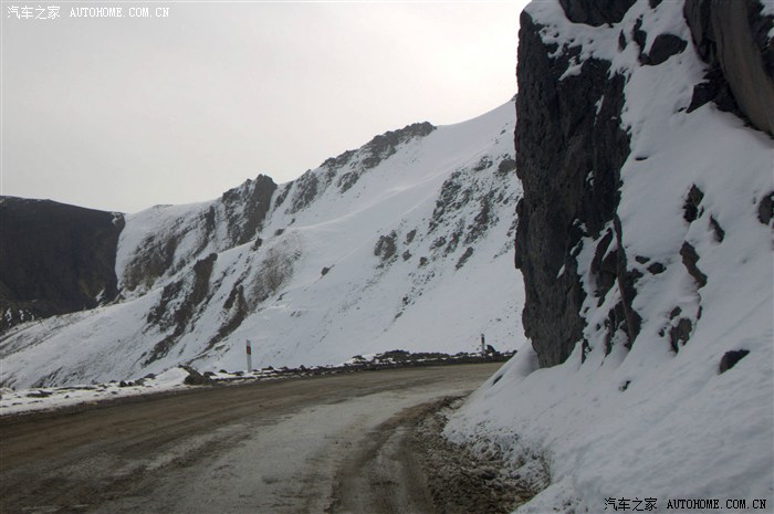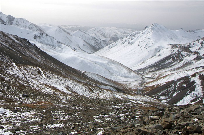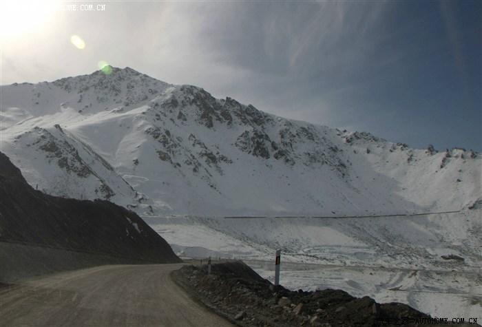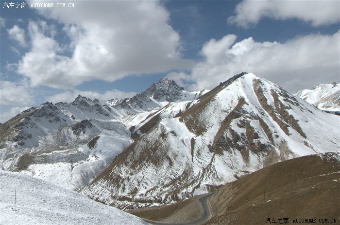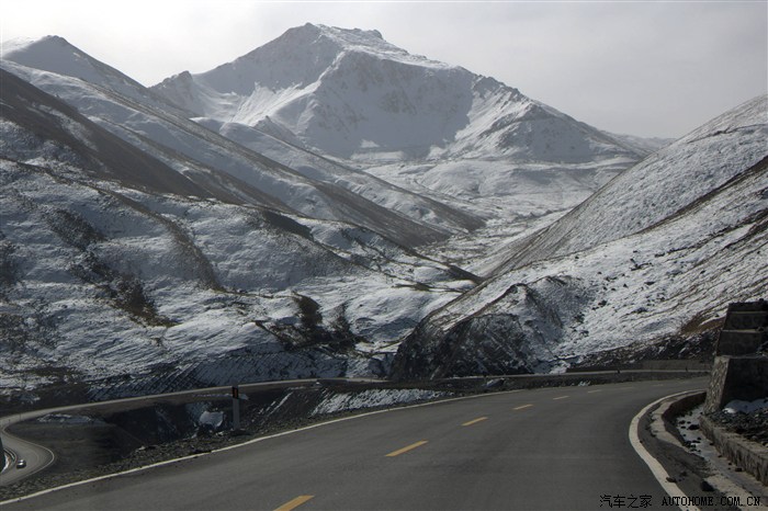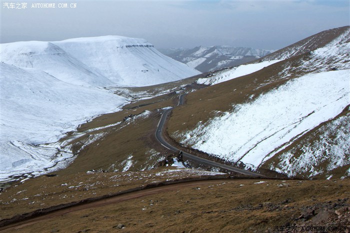 翻过山口,处于背阴面的山原都是白色的世界,公路就在这白色的世界中盘旋而下: