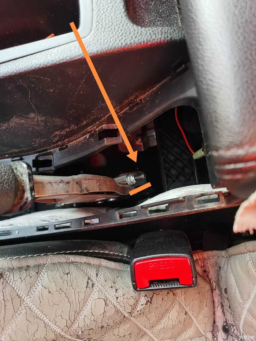 副驾位置处,左脚位置,中控台下方,有一个立着的塑料挡板,这块板有两个这种卡扣,也拆下来方便之后操作。