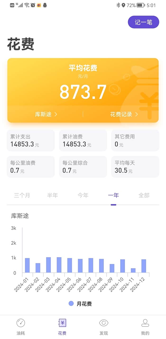 2024年1月到2024年12月份总共加油10633元。总共行驶了14603公里路,每天大概行驶41.6
