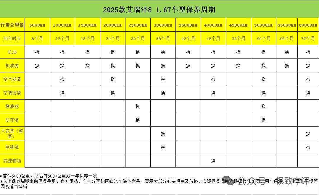 保养成本:根据保养手册来看,2025款艾瑞泽8 1.6T的首保为5000公里,后续每5000公里保养一次。其中虽然有时候允许保养周期有一定浮动,但超出范围过长可能影响相关部件质保,所以建议用户按时保养。一般情况下,4S店首保免费,所以在3年6万公里用户需要进行5次小保养(换机油+机油滤),4次中保养(机油+三滤)以及关键系统大保养。艾瑞泽8 1.6T车型小保养单次费用为520元;中保养小计830元(含工时费),关键系统保养为大保养,结合皮带检查、轮胎换位等检查项,单次费用约1200元。部分门店会推出保养套餐等,工时费也通常会打9折,所以优惠后该款车6万公里保养总费用累计约5200元。非4S店工时费以及材料费都有所下调,或有的用户会自带配件,费用会比4S店便宜得多,6万公里保养成本预估费用为2700元。总的来说,以艾瑞泽8 1.6T车型的首年用车成本为10452元,保险费用为4907元,保养费用为1733元。总计该款车的首年用车、养车费用为17092元,平均每公里综合费用约0.85元。前三年随着用车年限的增加,保养成本基本会有所下降,如果不出险的情况下,保费也同样降低,4S店保养六万公里总费用为49256元,该车的三年平均每公里综合费用约0.82元。非4S店保养,六万公里总费用为46756元,平均每公里综合费用为0.78元。以上费用没有包含停车费、过路费、洗车费等“零碎用车成本。