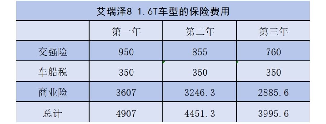 艾瑞泽8车型是一款五座车,首年交强险费用为950元,车船税(1.5T)为350元,无论是不是首年交保费,这两项都是必交的。如果在不出险的情况下,保费还会进一步下调,我们当地保险公司的折扣分别为9折和8折。首次买车商业险也购买,全险包含第三者责任险、车辆损失险、车身划痕险以及车上人员责任险(司机)/(乘客)。根据经验来看,一般用户会选择赔付额度为100万或200万的第三者责任险,部分豪华车型或一线城市还有人会选择300万及以上的赔付额度。本文就以100万第三者责任险赔付额度为例,同时仅缴纳车损险的情况下计算得知,该款车的首年保费为4907元。此外,如果是新手或所在区域停车环境复杂的朋友更建议选择划痕险,至于车上人员责任险,就看你的用车范围如何,如果家人长期乘坐,也可选择(乘客),反之,选(司机)就够用了。总的来说,如果购买艾瑞泽8 1.6T车型后,商业险仅缴纳第三者责任险和车辆损失险,该车的保费并不算贵,而且不出险的情况下,费用会有所下调,前三年总计费用为13354元。商业险选择不同,费用也略有浮动
