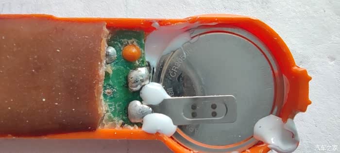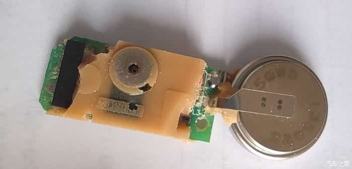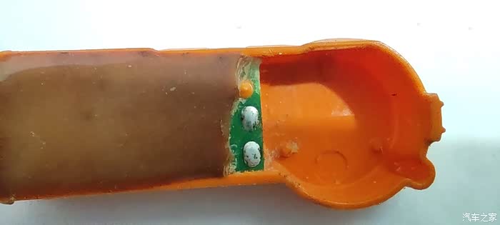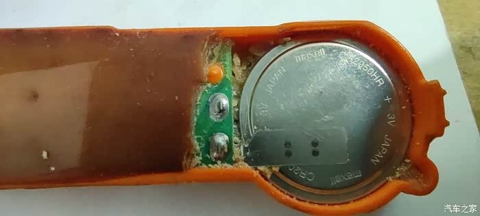 这是第一次不知道怎么换电池,整个拆下来的样子,外壳上有个铁件是焊电路板上的,有两个塑料顶柱是铆焊在电路板孔里的,拆的时候是强行撬开的,后边三个传感器是只拆电池不用拆电路板,这样就简单多了