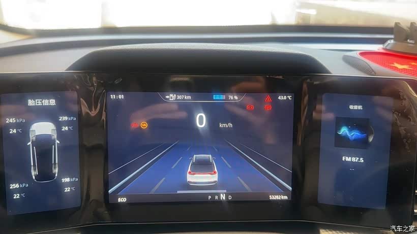 瞅瞅,这还没开呢,外界气温43度,还是在车库里面停着的。