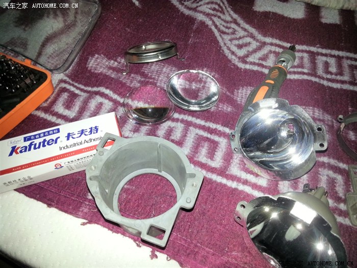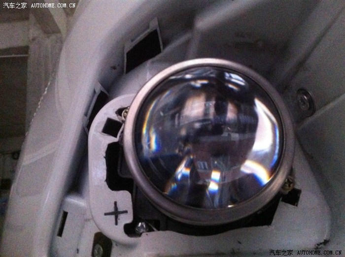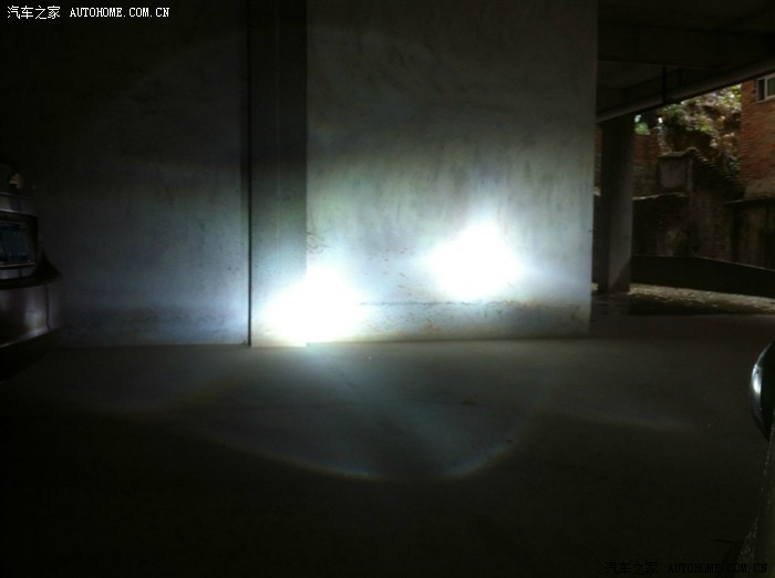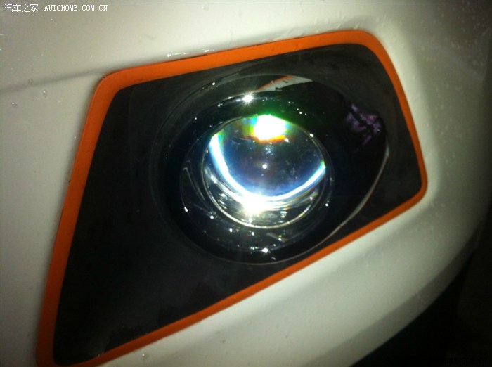 海蓝星 50W飞速快启安定+45W球泡这颗透镜是蒙迪欧拆车的远光透镜 X宝70 一只 买回来全拆开了涂上胶防水切割铁皮做支架。。。。没眼睛的翼搏 很酷吧 还没调好,原车的灯光....