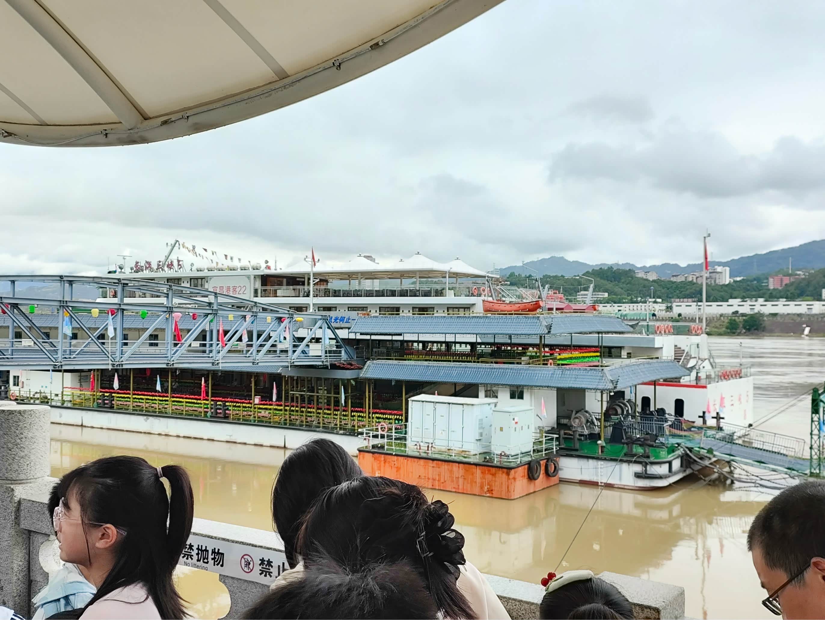 首先体验的是三峡升船机。当我们驶入升船机时,大家都兴奋地跑到甲板观赏着三峡这座末日城堡似的大国重器,不仅人显得渺小就连船也显得微乎其微了。随着升船机缓缓启动,我们能清晰地看到船体在 “电梯” 中上升,电梯是把船连同着水一起抬了上来,经过了30分钟,游船便从下游升至上游,这种 “船舶坐电梯” 的奇观,让我们不禁感叹中国工程技术的强大。同行的孩子一边观赏着,一边拿着相机不停拍照。?