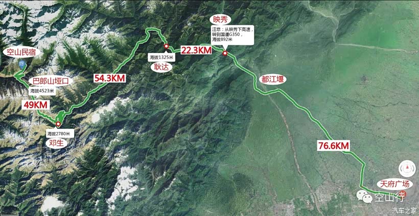 成都天气很好,为了错峰出行,中午12:00准时从家里出发,经都汶高速后到映秀出口下,转国道G350(中国熊猫大道)。此路线全程路况良好,从海拔约500米的成都平原,一路抬升至超过3000米的川西山地,沿途风景目不暇接,经过都江堰、青城山、卧龙大熊猫基地,和景色雄奇的大雪塘、巴朗山,中途可以在贝母坪露营点下车拍照。