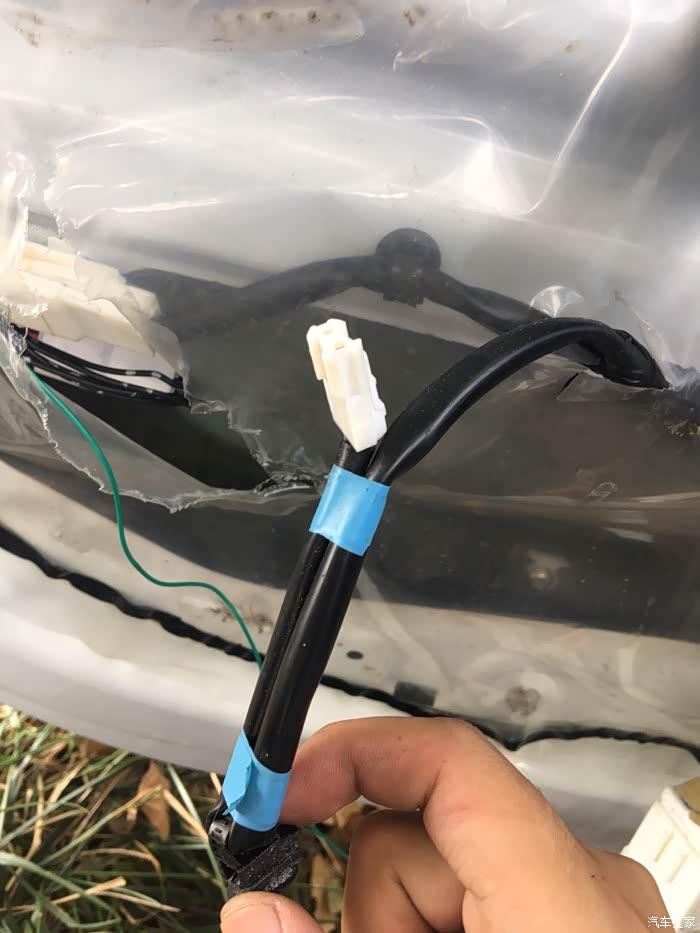 本来我以为要把12V电源线穿到驾驶位接线,谁知道拆开门板后有惊喜,原车预留的有门板灯的插头,那上面那根蓝红色线就是12V电,这样就省很多力气了!直接接这上面