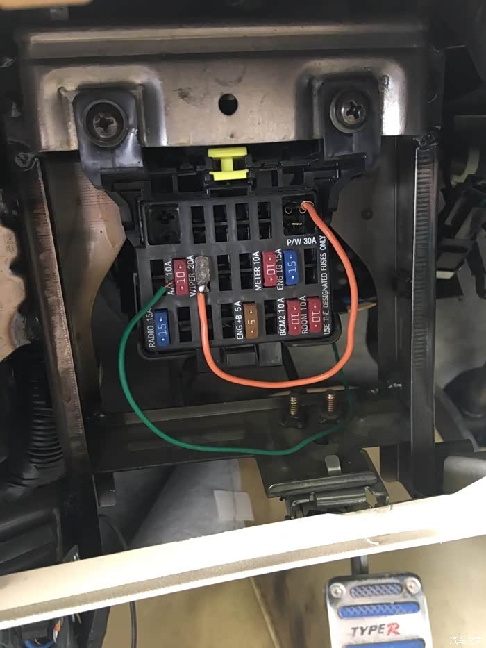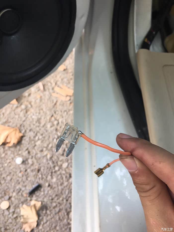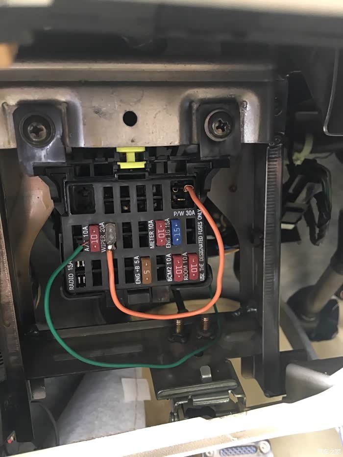 这个是原车拿掉的20A的保险,由于接在了门灯线上,怕门灯线保险小,把保险盒右下角的那个10A的红色保险替换掉