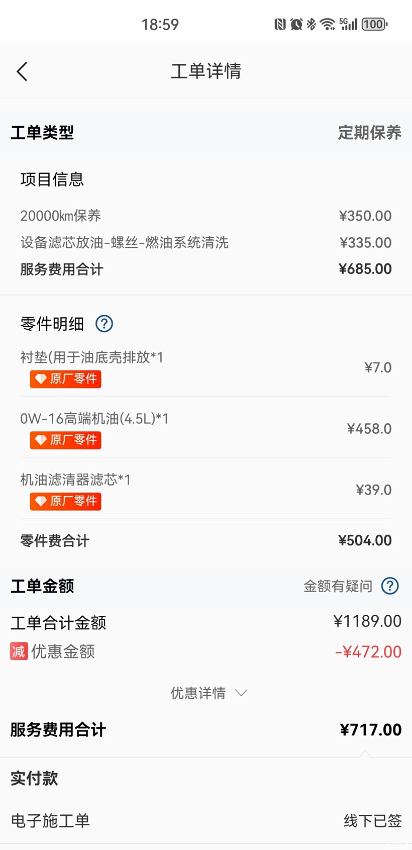 提前预约了保养时间,到店后保养客服便提供了一个约2000多元的保养项目,我在其中选定了图中必选的保养项目,其中工时费是685选,材料费是504元,总计是1189元(图中优惠的金额是车买保险时保险公司赠送的)。车友们你们的保养费用是多少?