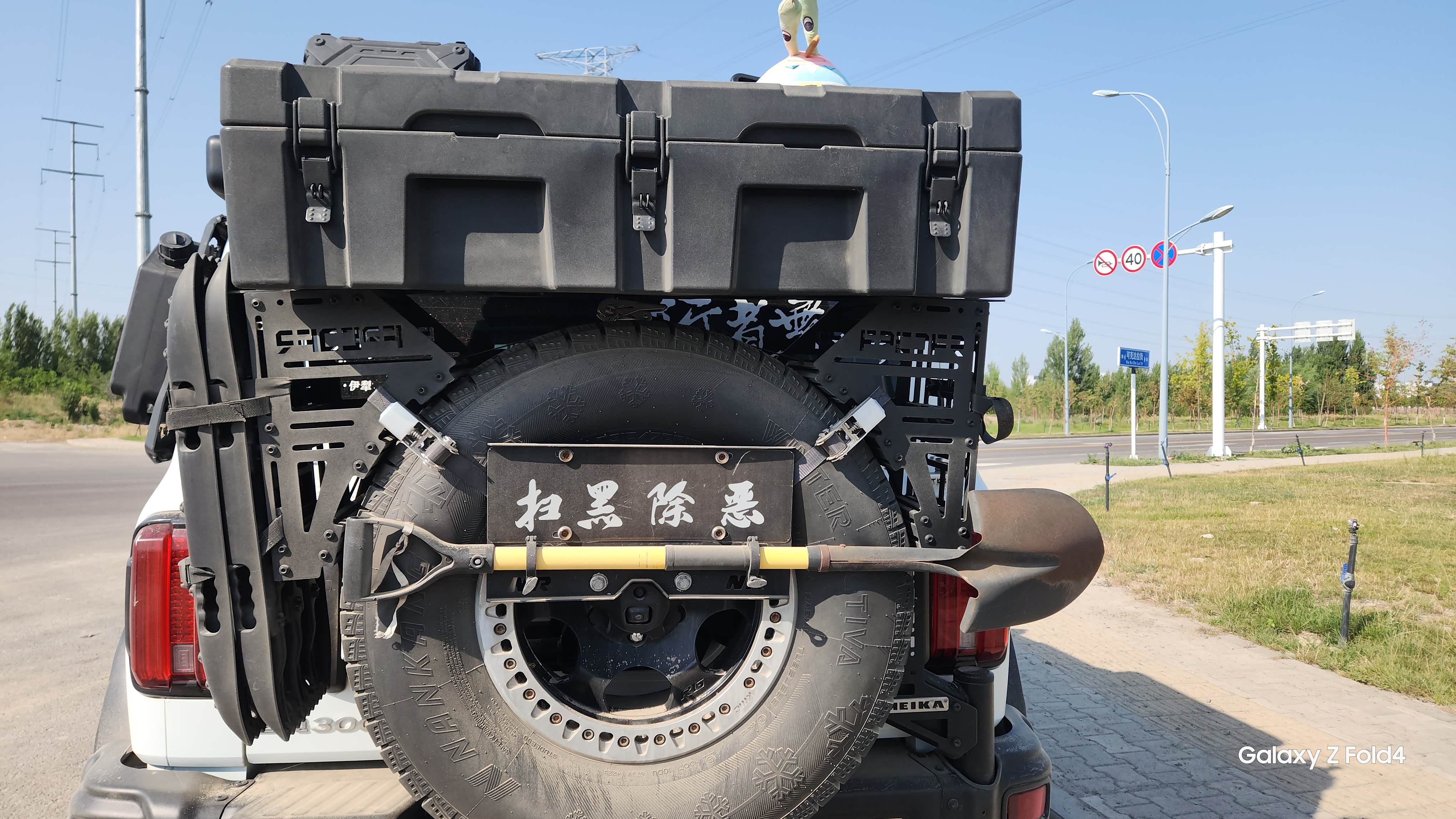 还有一个必须夸的小物件,就是备胎上挂的这把铲子,出去玩陷车的时候是真有用的。备胎上的置物盒,是用绑带固定在备胎上的,估计全国都没几个这样的设计。轮胎上我还加了个减震器,过减速带不再 “哐当” 硬邦邦了。