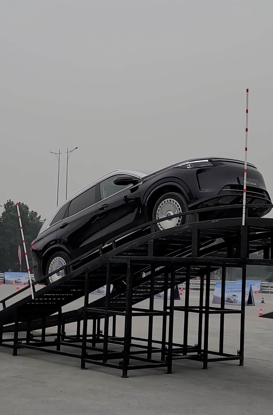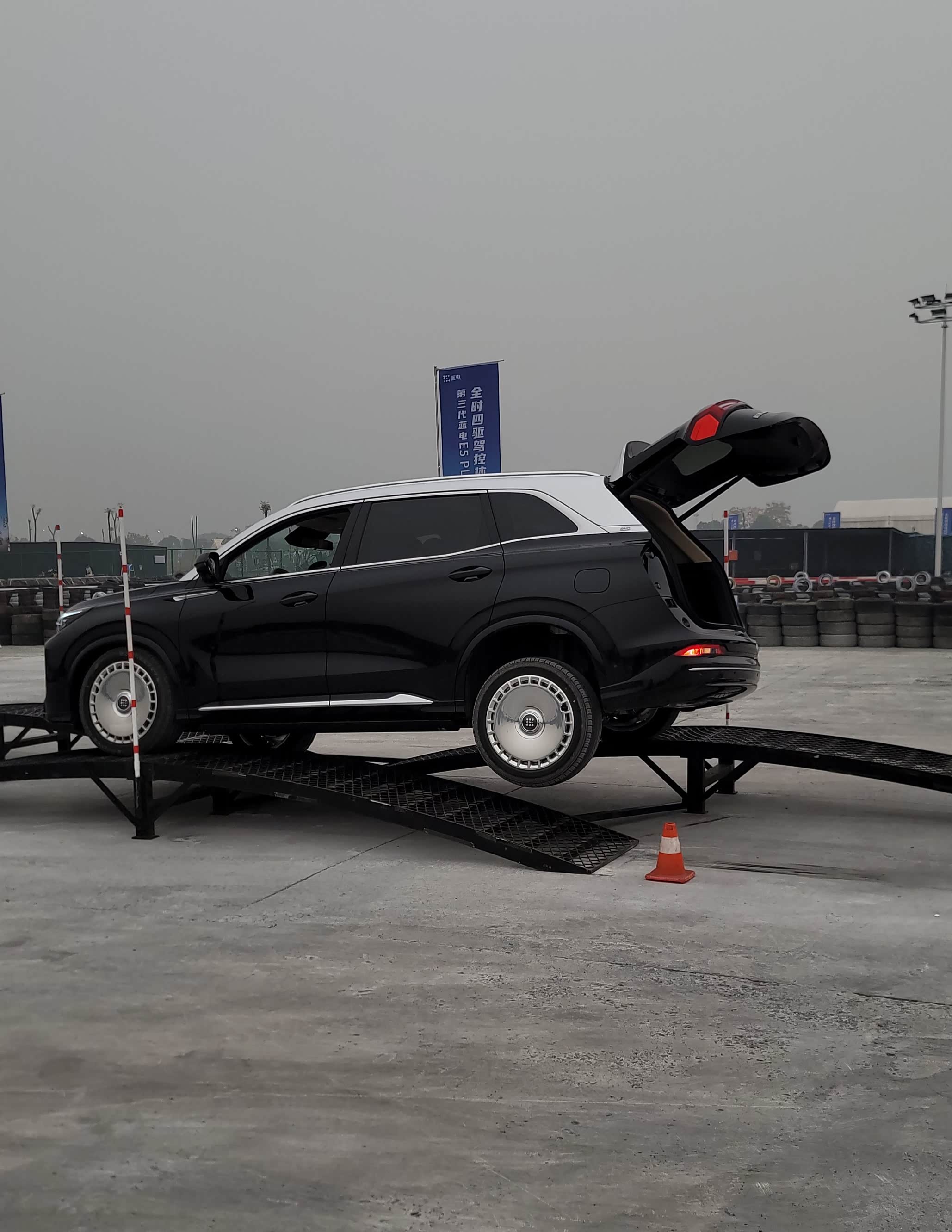 《交叉轴刚性测试》这个交叉轴项目会让整个车身像拧麻花一样受力,不仅对底盘和减震器耐力是一个考验,更考验整个车身的刚性,如果车身不硬的话,会轻微变形导致车尾箱打不开,蓝电也是不慌不忙稳稳停住,后备箱正常打开行无压力。