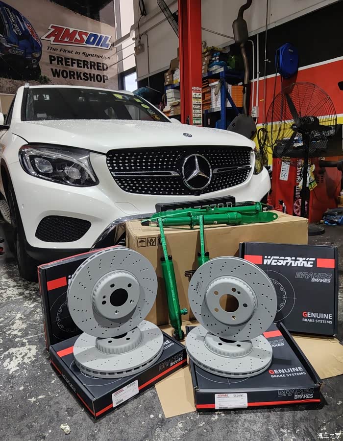 ?AMG GLC43(高性能版):前轮360mm通风打孔盘,4活塞固定卡钳;后轮320mm通风盘,单活塞浮动卡钳。
