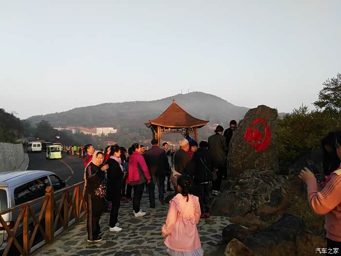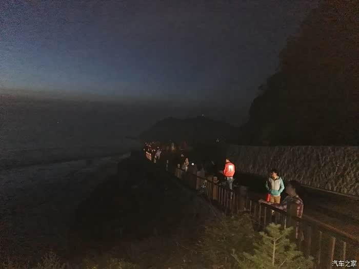 都快六十岁的人了还没看过日出哪!遗憾吧!所以,在这次丹东行程里必须看到日出。10月3日凌晨4点钟漆黑的天伸手不见五指。打着手电向观日出的山顶登去。还别说,在漆黑的夜晚登山还真的有点慎得慌......上图......爬了40分钟漆黑的山路。终于登上了观日出的亭台。黑吧?!天渐渐的有了一线光亮。观日出的人们也陆陆续续的多了起来......看,过了不多时人群已是黑压压的了......5点多钟东边的海岸线开始露出金黄色的光线了太阳快出来了!5点38分太阳终于从海平线上伸出了通红通红的头,暖暖的肉头头的。此时的天空和海面已经浑然一体朦朦胧胧的红!这展现在你面前难得一见的美丽景像,把你融化在了神奇的大自然...