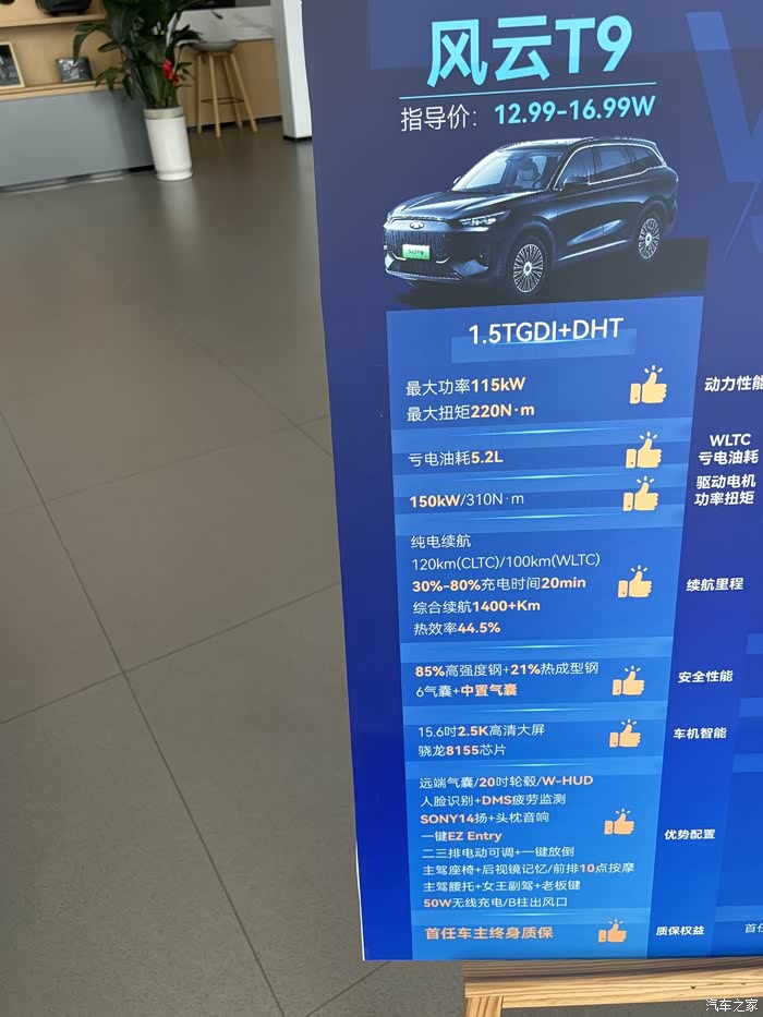 奇瑞风云T9产品特性一:风云T9这款车整车用料同级第一,整车高强度钢使用率达到85%热成型钢,使用率达到21%,铝合金防撞钢梁,横向覆盖率85%,高140mm,前端6吸能盒安全防护,三层18条吸能路径,侧面二层10条吸能路径。全系标配7个安全气囊、同级别唯一标配远端气囊、2060mm 贯穿式侧气帘,6S超长保压。为司乘人员提供更加安全的用车环境。整车安排风云品牌享受三电系统、整车终身质保,节约了客户的使用成本,增加了客户的使用信心。缺点是目前4S店面较少,对质保政策宣传力度不够,条款不够清晰。感兴趣的朋友可以直接在评论区留言,我来详细给您解答。