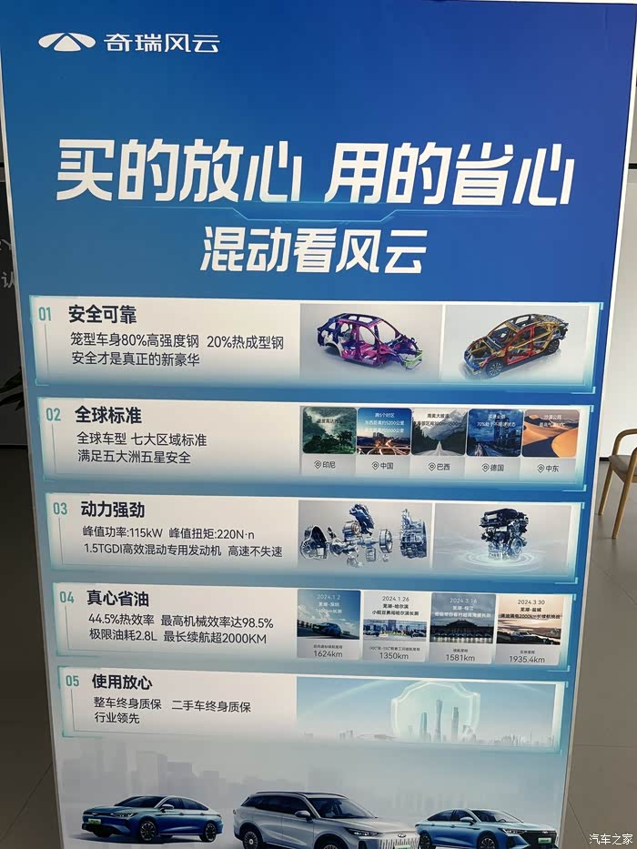 奇瑞风云产品特点二:风云T9这款车采用了1.5T涡轮增压混动专用发动机,采用了一块19.43度的三元锂大电池,仅仅需要20分钟就可以将电量从30%补充到80%—满油满电续航可轻松达到1400公里以上,在最新最接近用户使用的WLTC工况下,他的馈电油耗也仅仅只有每百公里5.2升的油耗,非常的经济实惠。