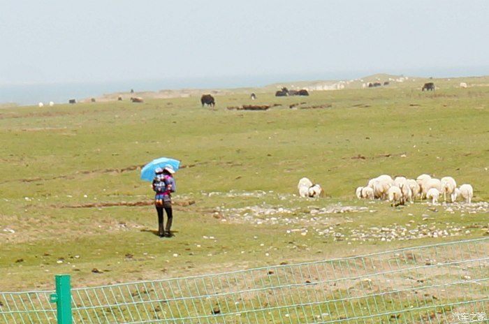 背着娃打着伞在广阔的大草原上放羊,好辛苦。