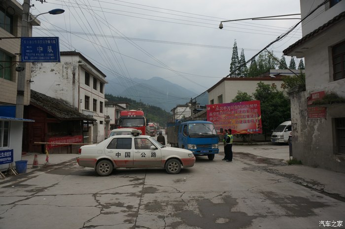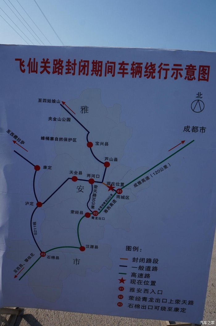 飞仙关修路封闭了,交警在耐心的让返回改道。飞仙关—国道318线、飞(仙关)宝(兴)公路在此交会。画家张大千1948年曾亲笔为飞仙关作画。