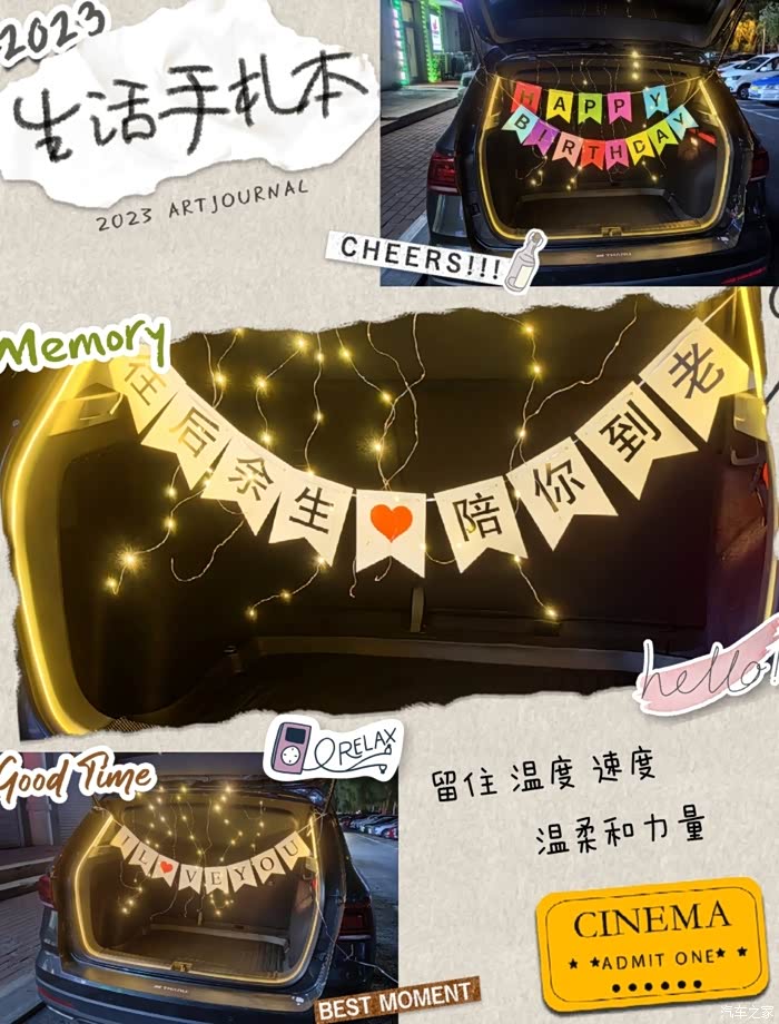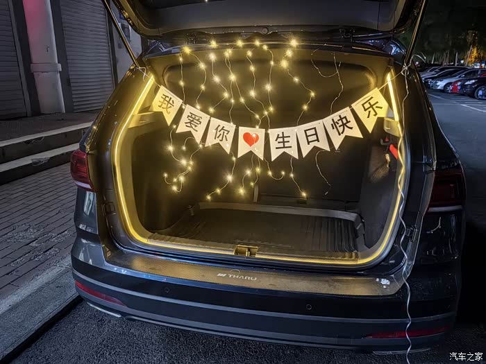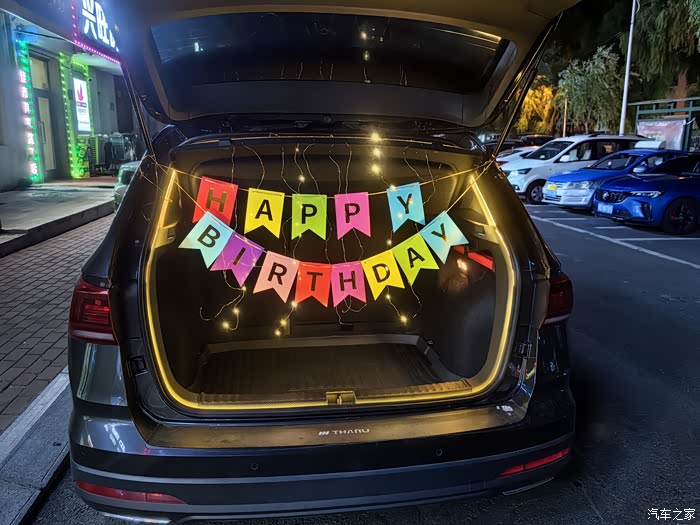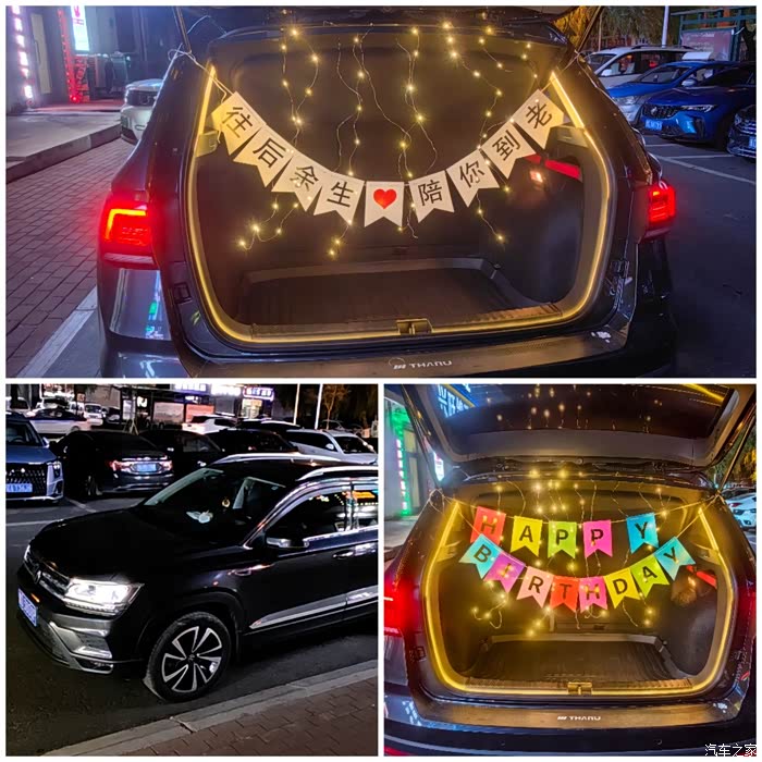 后备箱灯带安装好后,我就有了大有可为的提升空间,可以加装一些星光灯,彩色条幅, 求婚/生日横幅等 ,用LED灯带勾勒“生日快乐”等字样,搭配气球、彩带,营造立体光影效果。