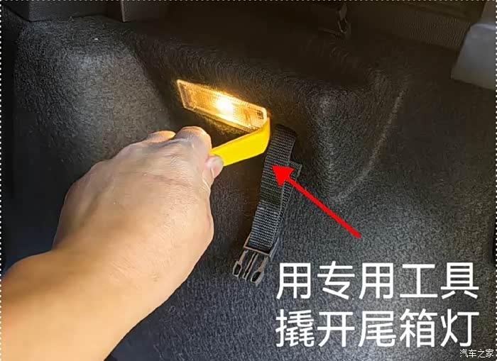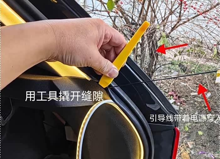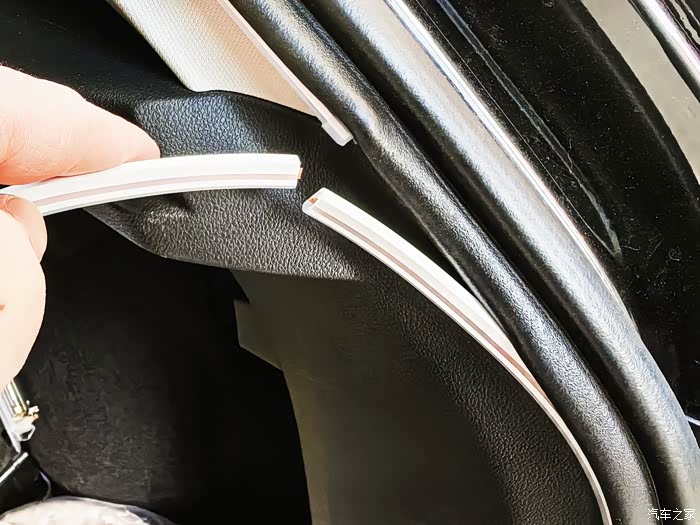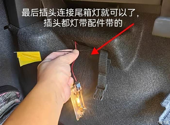 撬开软胶皮缝隙,将线材沿着车体边缘走至尾箱灯处,接入分插头。利用尾箱灯 的开启关闭进行同步开关。