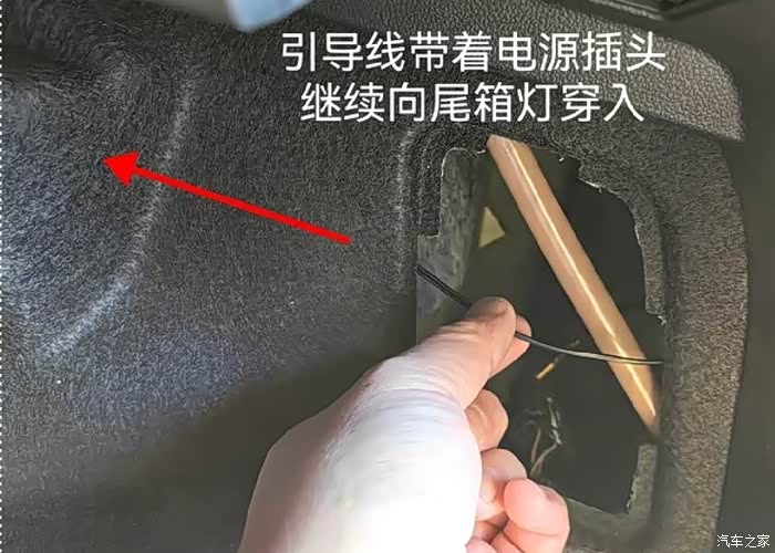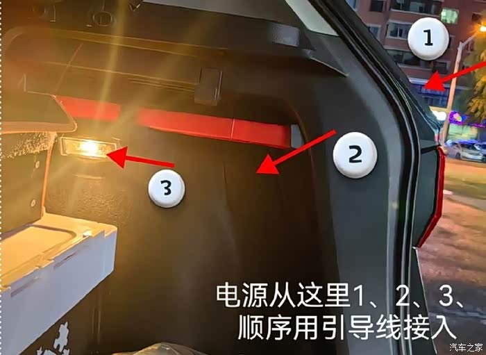 1. 定位电源:途岳后备箱左侧有个12V电源接口,但为了美观,我选择从尾箱右侧灯位置隐蔽走线。